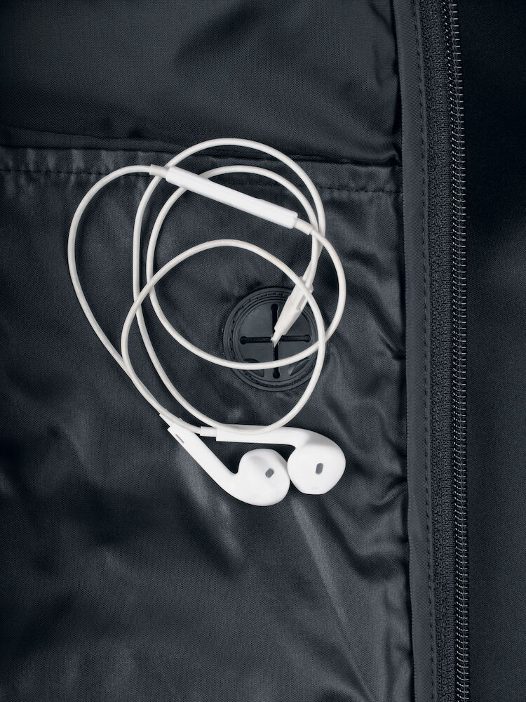 En lett polstret fleecejakke med reflekterende trykk. To sidelommer med glidelåser. Skjult lomme i ermet med glidelås, to innerlommer og tommelhull. Leveres med løsninger for øretelefoner.