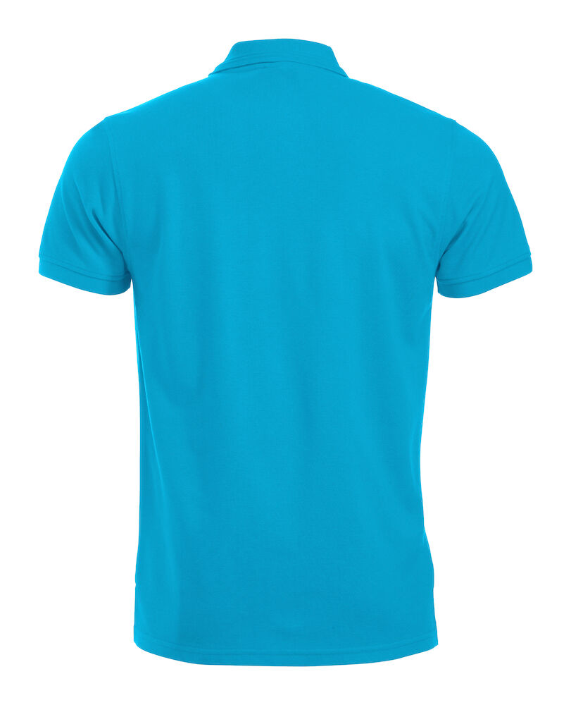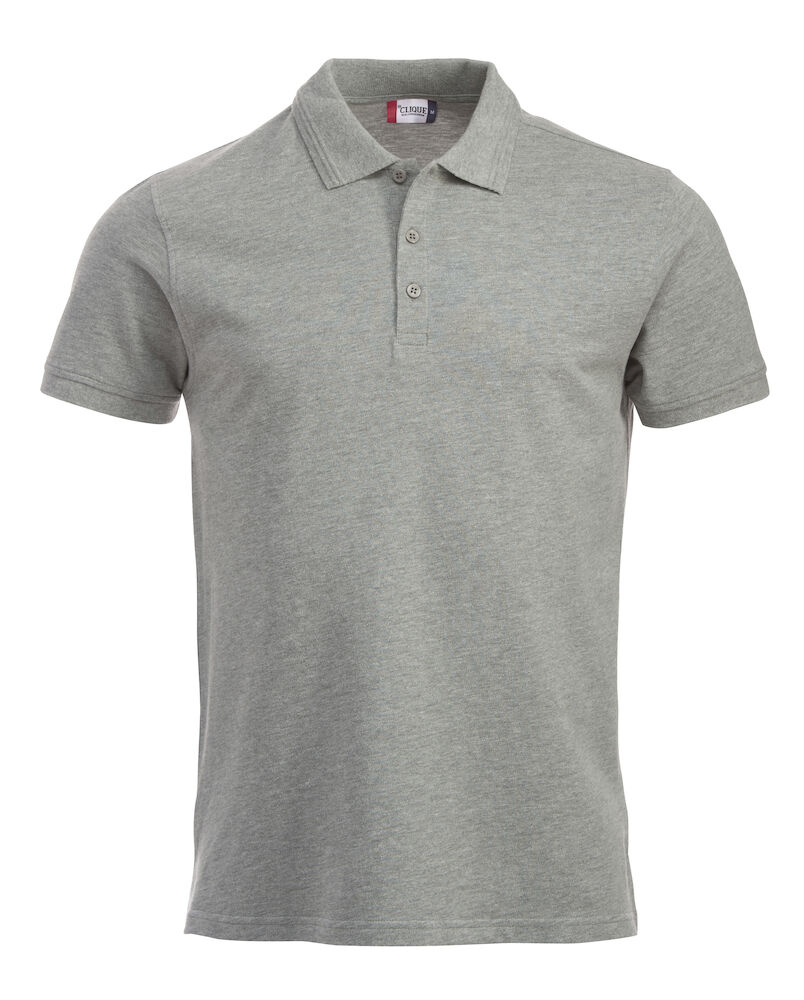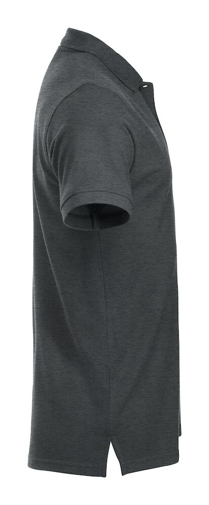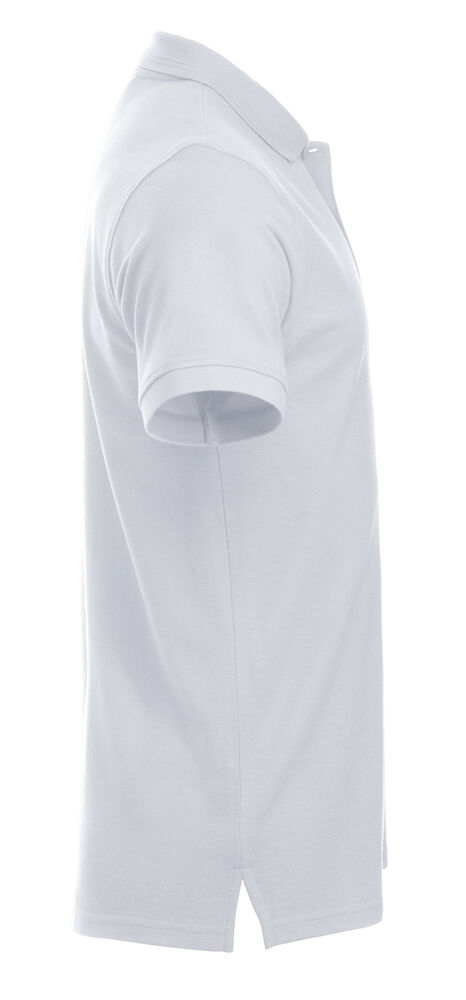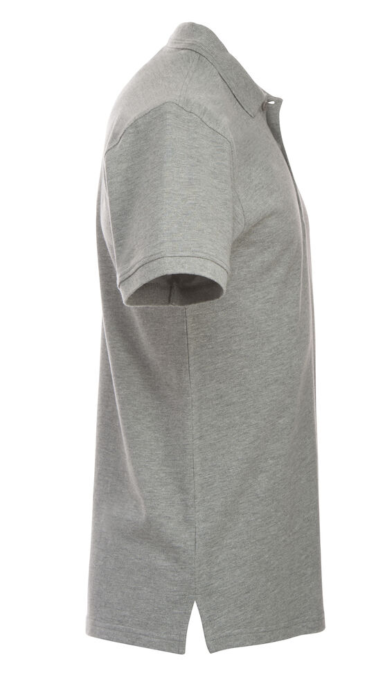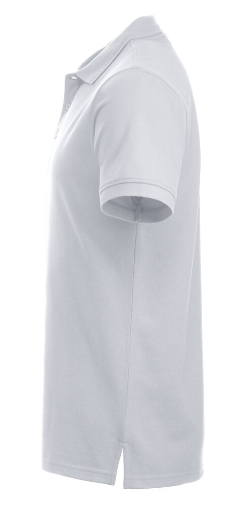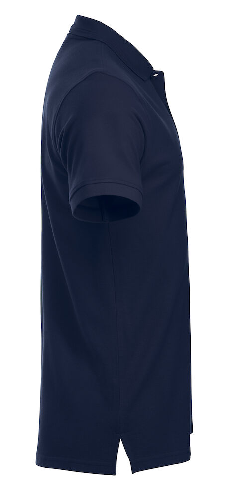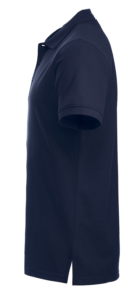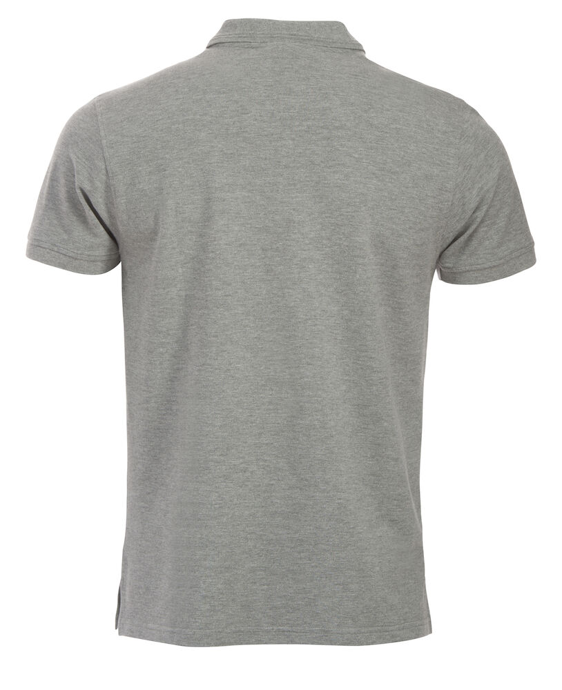 Pique med to jaquardstriper på kragen. Knappestolpe med tre knapper som går ton-i-ton og splitt i sidene.