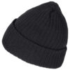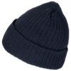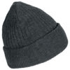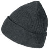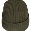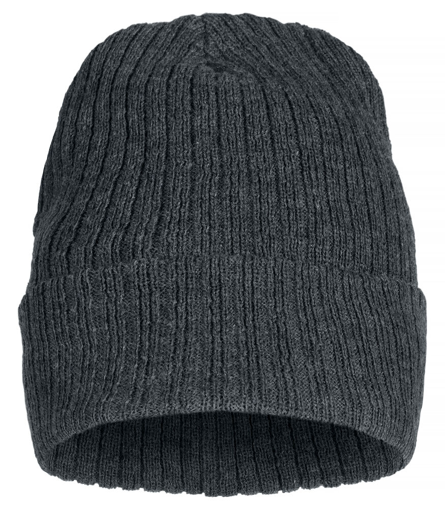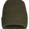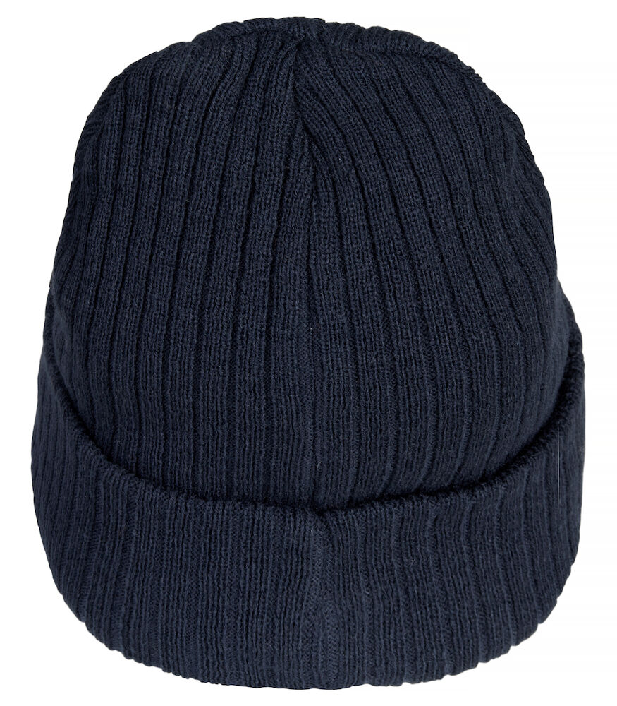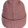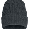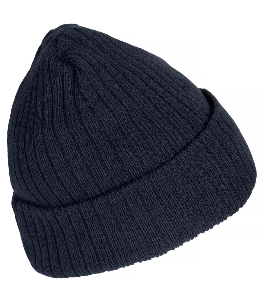 Ribbestrikket lue med brett og fire sømmer øverst.